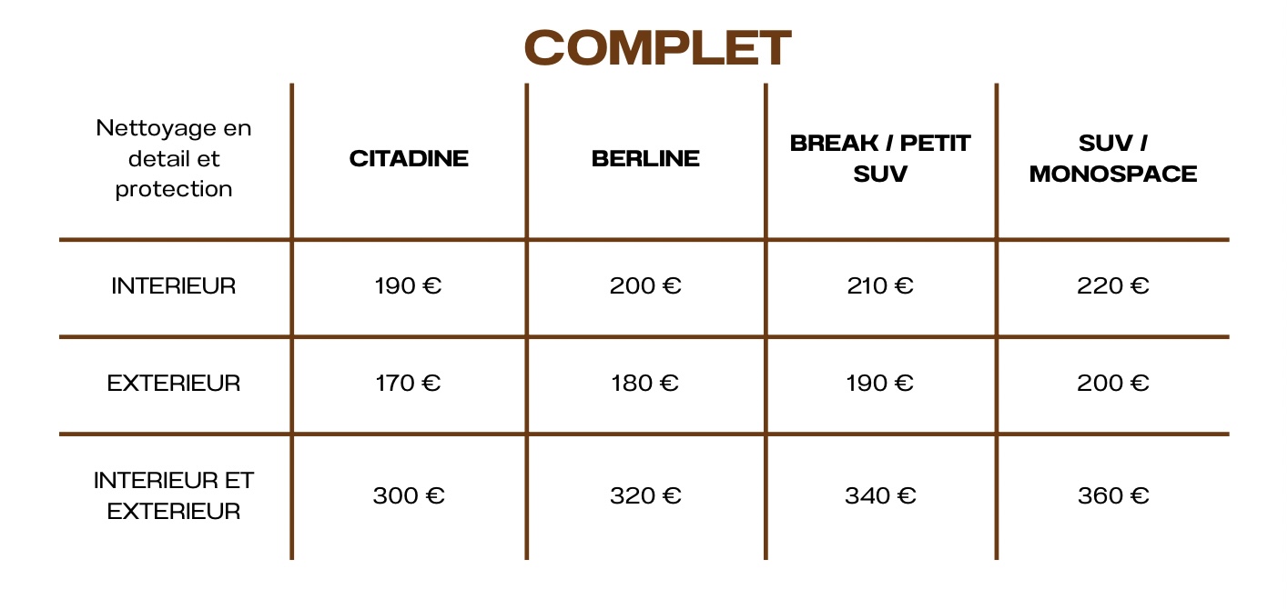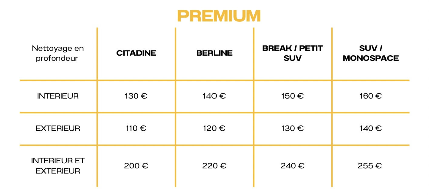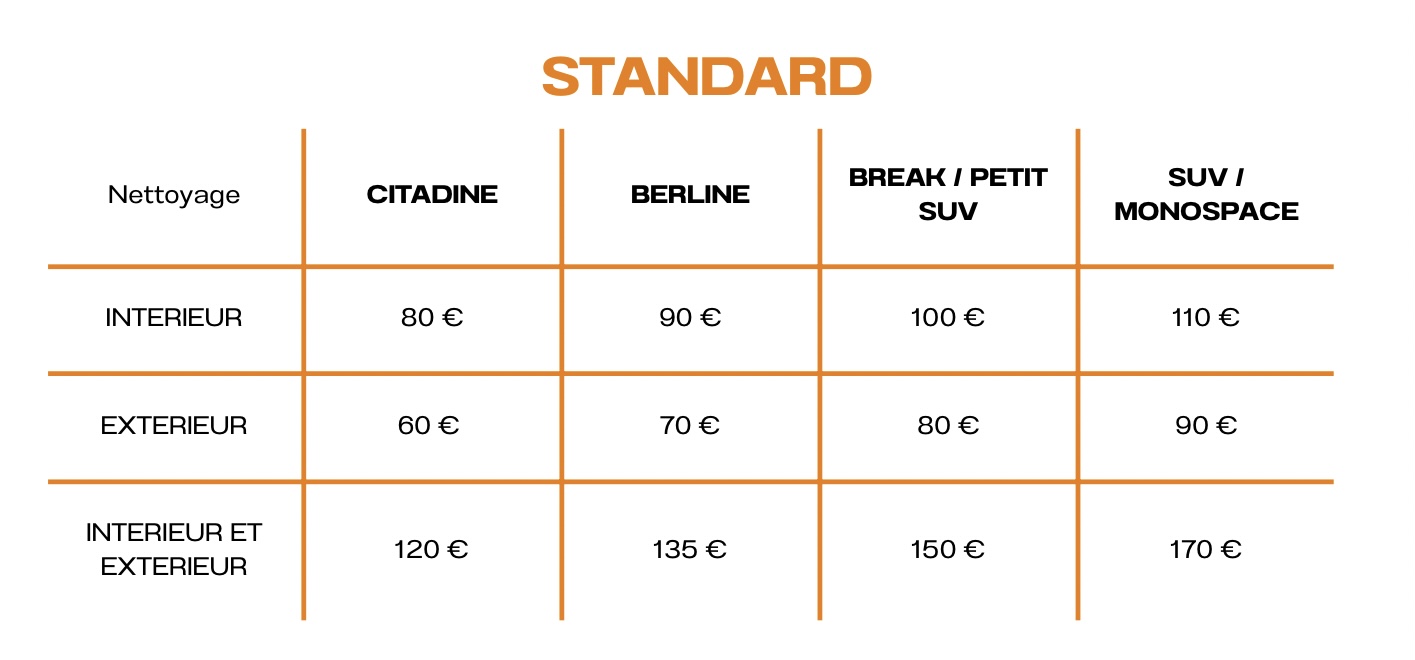 Les prix et durées peuvent être ajustés selon les services, la taille et le niveau de saleté du véhicule.